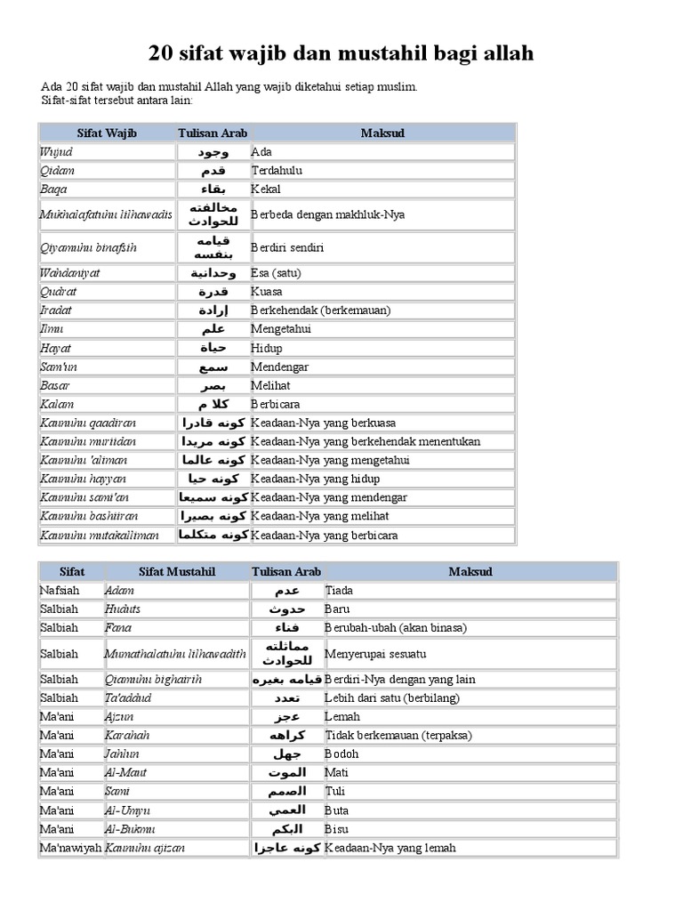 1 sifat wajib allah berikut arti dan penjelasannya tabel 20 sifat wajib allah dan artinya. Sifat sifat allah, sifat sifat wajib allah, sifat sifat mustahil allah, dan sifat jaiz allah beserta artinya dan dalil al qur an yang perlu.